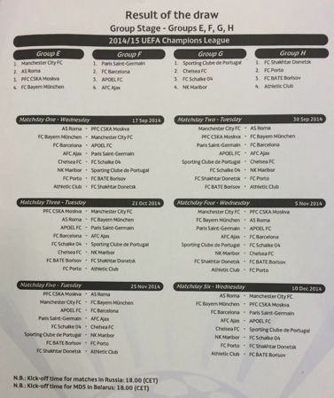 Já se sabe as datas em que o Sporting irá disputar a Liga dos Campeões. A equipa leonina entrará em campo na Eslovénia frente ao Maribor a 17 de Setembro. A segunda jornada da fase de grupos será no dia 30 em Alvalade, dia em que o Sporting receberá José Mourinho e a equipa do Chelsea. No dia 21 de Outubro iremos visitar o Schalke 04 à Alemanha a 5 de Novembro receberemos os alemães em Alvalade. A 25 de Novembro recebemos o Maribor e fechamos a fase de grupos com a visita a Londres para o embate com o Chelsea.